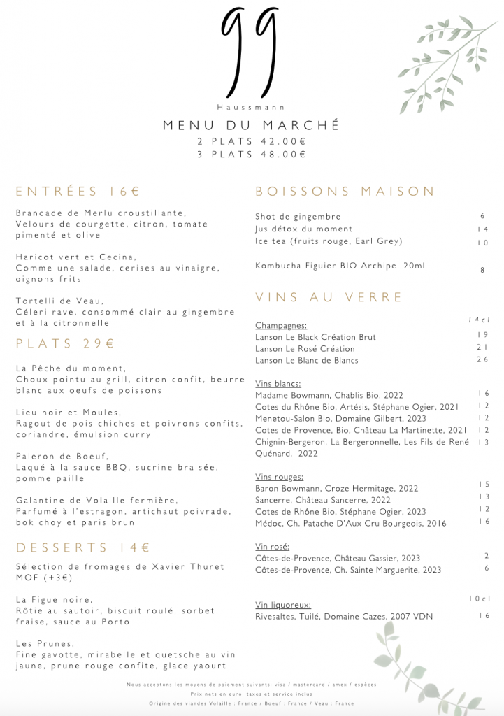 Notre avis complet sur le Menu du Marché du 99 Haussmann de l’hôtel Bowmann à Paris :